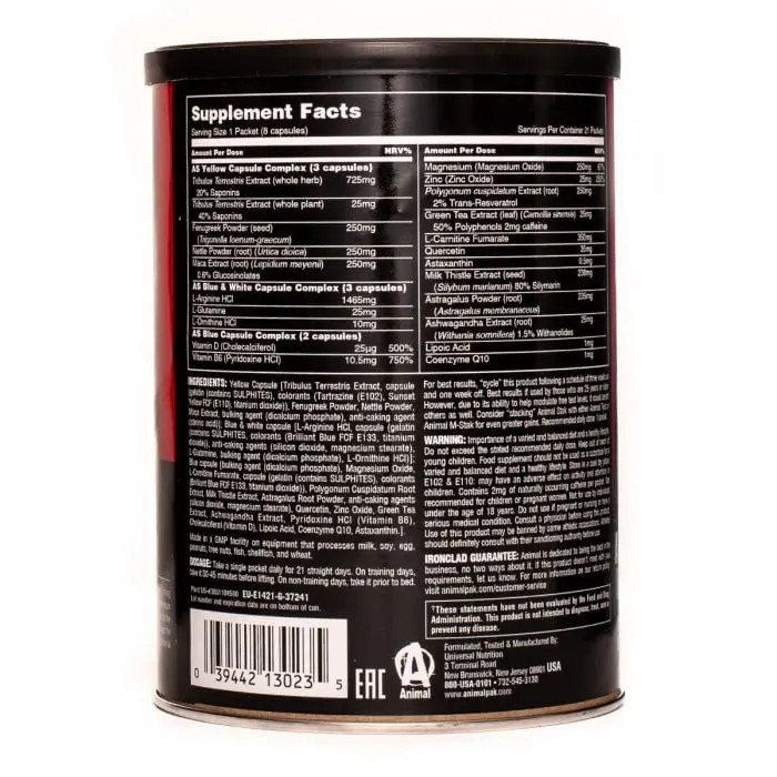 Az AS Complex 3 utolsó eleme pedig különböző ásványi anyagokat, antioxidánsokat, növényi kivonatokat és egyéb funkcionális anyagokat tartalmaz. A cink a legkiemelkedőbb, és hozzájárul a vér normál tesztoszteronszintjének fenntartásához. A sportolási igényeket tekintve ezt jól kiegészíti a magnézium, amely hozzájárul a normál izomműködéshez, és a B6-vitaminnal együtt a fáradtság és a kimerültség csökkentését is támogatja. Érdemes megemlíteni a benne lévő Q10 koenzimet is, amely részt vesz a sejtek működésében. Segíti a mitokondriumokat az ATP formájában történő energiatermelésben is, amit nem csak az intenzív edzések során fogsz értékelni. Az Animal Stak tehát egy hatékony keverék, amelyet a profi és szenvedélyes erőnléti sportolók, testépítők, erőemelők és súlyemelők értékelni fognak.