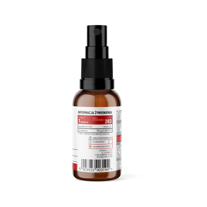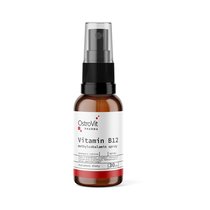 Pharma B12-vitamin spray 100 µg B12-vitamint tartalmaz egy adagban. Számos folyamatban vesz részt a szervezetünkben. Fogyasztása hozzájárul a megfelelő az immunrendszer működéséhez, a fáradtság és a kimerültség csökkentéséhez, illetve támogatja a jó közérzetet is. Praktikus spray formájában kapható, amely nagyon könnyen használható.Pharma B12-vitamin spray - vitaminkiegészítő, amely hozzájárul az immunitás megfelelő működéséhez és csökkenti a fáradtságot vagy a kimerültséget