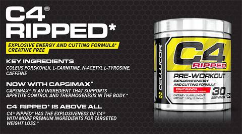 A C4 Ripped edzés előtti készítmény szálkásításhoz, amely kombinálja a C4 kirobbanó erejét és a zsírégetéshez szükséges egyedülálló összetevőket. Összetevők, melyek jelentősen hozzájárulnak a zsírégetéshez, ugyanakkor a maximális teljesítményt és bedurranást ösztönzik. A fáradtság elleni alkotóelemek (B12), metabolizmus támogatók (B6) fokozzák az éberséget, késleltetik a fáradtságot (zöld kávé kivonat, cayenne-i bors és egyebek)