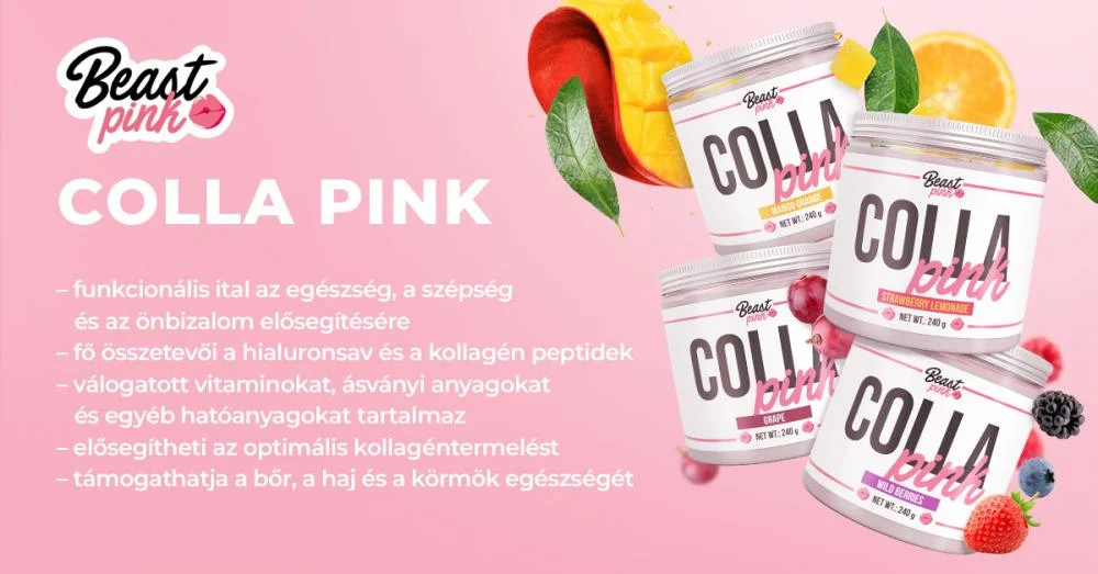 A Colla Pink egy szépségital minden nő számára, aki szeretne megfelelő gondot fordítani a megjelenésére, a mozgásszervi rendszerére és az általános szépségére. Ennek a komplex tápálékkiegészítőnek a fő összetevői a kollagén peptidek, amelyeket hialuronsav, szőlőmagkivonat, valamint válogatott vitaminok és ásványi anyagok kombinációja egészít ki. Ébreszd fel a szépségedet és nőies önbizalmadat ennek a finom italnak köszönhetően.