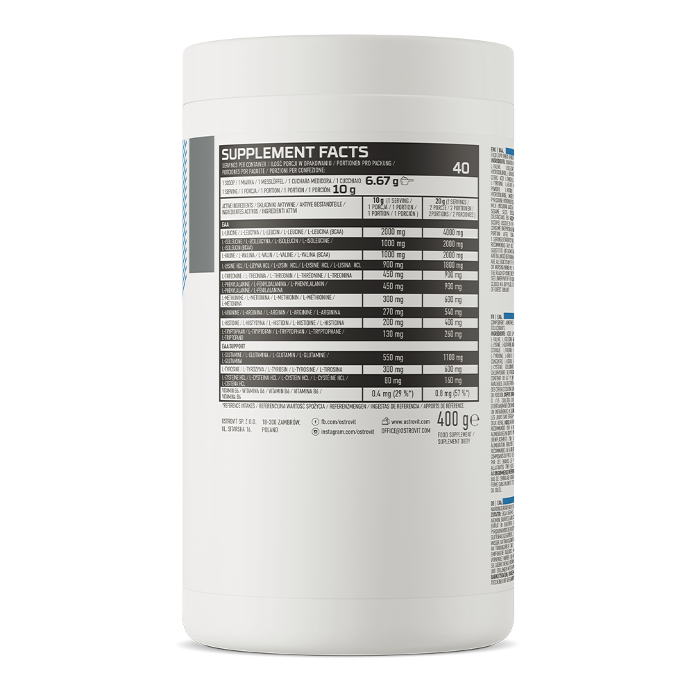 Az EAA esszenciális aminosavak komplex forrása por formában. A test számára azért fontosak, mert részt vesznek a fehérjetermelésben és támogatják az izmok növekedését és megtartását. Fontos, hogy pótoljuk őket az étrend vagy táplálékkiegészítők által, mert a test nem képes őket önmaga előállítani. Az Ostrovit EAA emellett L-glutaminnal, L-tirozinal, L-ciszteinnel és B6-vitaminnal van gazdagítva. Összesen tehát 13 aminosav és B6-vitamin keverékéről van szó. Az EAA fogyasztásával fontos tápanyagok pótlását biztosítjuk, emellett pedig a kellemes íz is tetszeni fog.