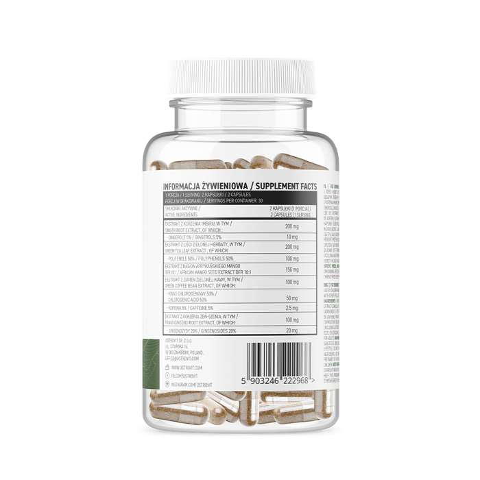Gyömbérgyökér-kivonat (Zingiber officinale Roscoe) - 5% gingerol, zöldtea-kivonat (Camellia sinensis (L.) Kuntze) - 40% polifenol, afrikai mangómag (Irvingia gabonensis L.) kivonata DER 10: 1, zöldkávé-kivonat (Coffea L.) - 50% klorogénsav, Panax ginseng levelének és gyökerének kivonata (Panax ginseng CA Mey.) - 20% ginsenosid, bevonóanyag (térfogatnövelő szer: hidroxipropil-metilcellulóz, zselésítő anyag: gellángumi; színezők: eritrozin, titán-dioxid, indigókármin).