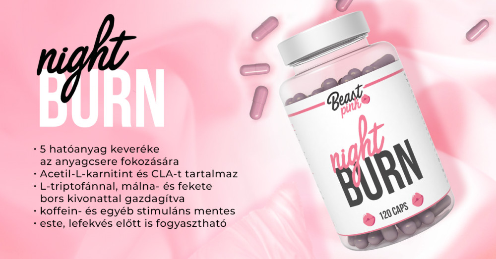 A Night Burn mindazon nők számára készült, akik még éjszaka is szeretnék fokozni az anyagcseréjüket, miközben alszanak. Ez az éjszakai anyagcsere serkentő 5 hatóanyagból álló komplexet tartalmaz, koffein és egyéb stimulánsok nélkül. Emiatt megfelelő étrenddel és testmozgással egybekötött fogyókúra mellé remek táplálékkiegészítő, amely nem befolyásolja az alvás minőségét.